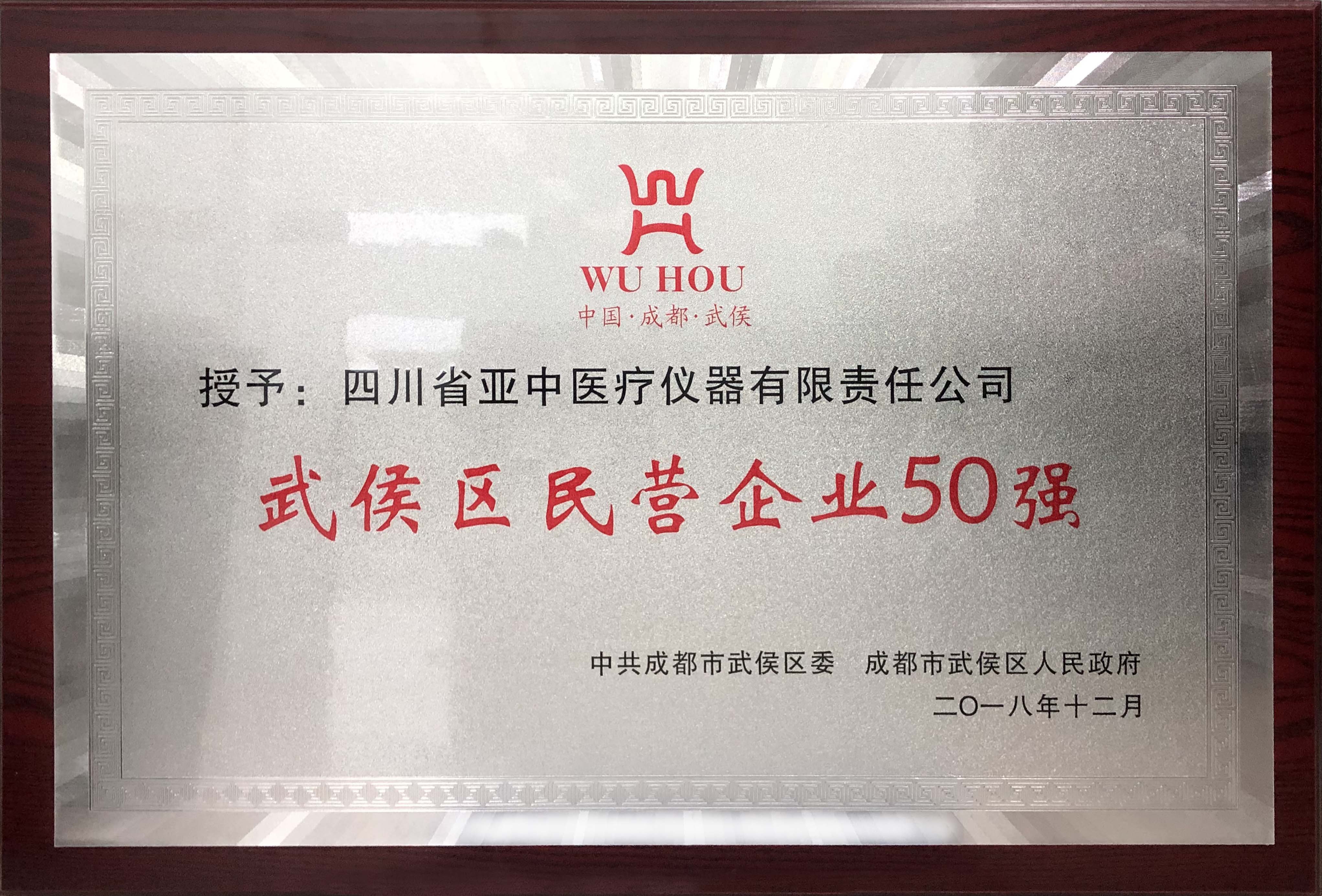 亚中医疗受邀参加了武侯区人民政府表扬2018年武侯区民营企业50强、优秀民营企业家的会议,亚中医疗在武侯区众多的民营企业当中脱颖而出,获得了两项重量级奖项,集团总公司获得了2018年武侯区民营企业50强;集团董事长徐树明先生获得了武侯区优秀民营企业家的殊荣。